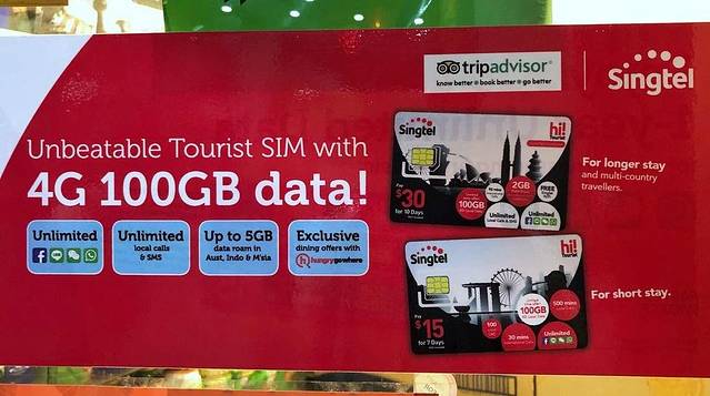 Singtel新电信旅游卡有两种,15新币/张只限新加坡使用7日,不限流量,30新币/张适用于马来西亚、泰国、新加坡等多国。樟宜机场只有30新币的卡,进入市区在7-11便利店都可以买到小额的,不过记得带上护照哦。