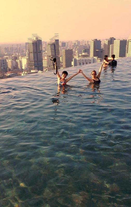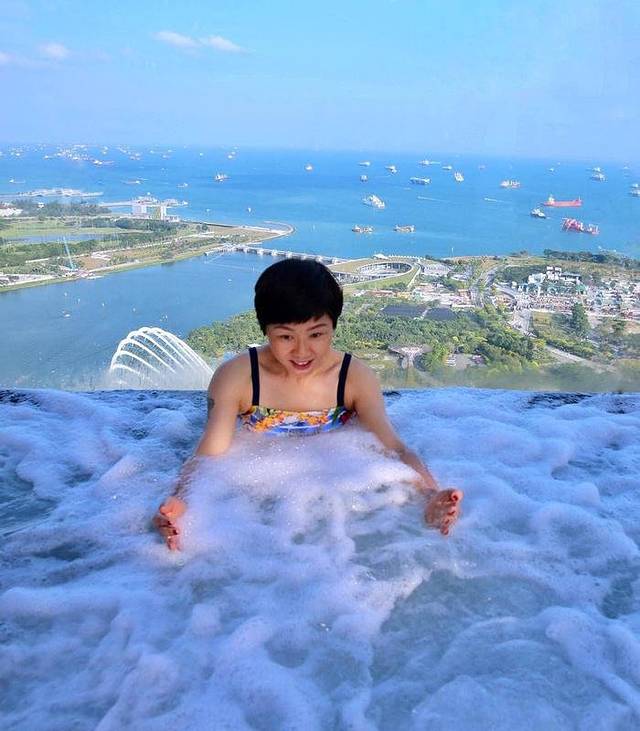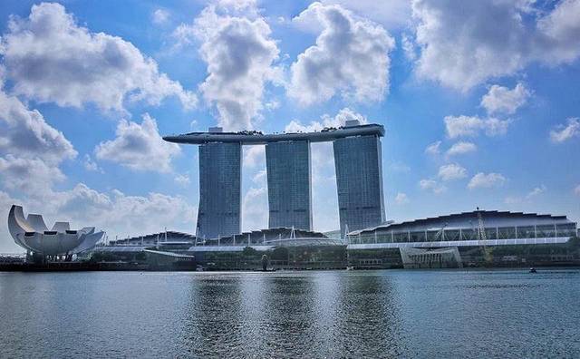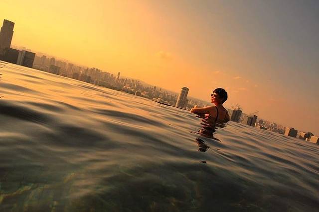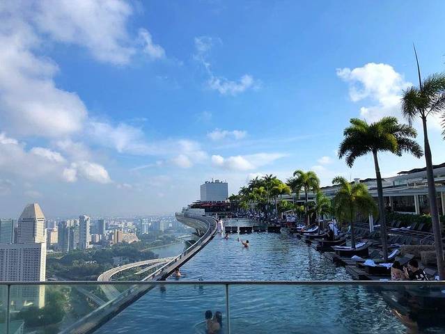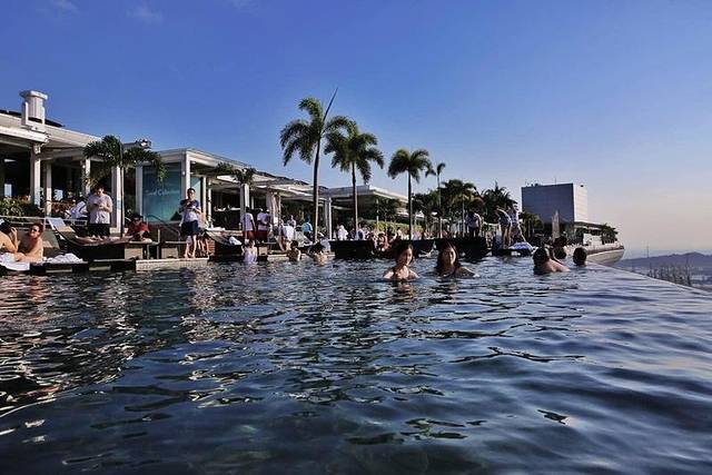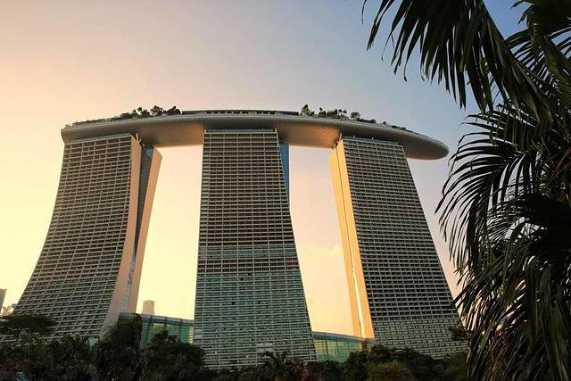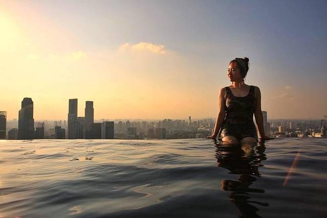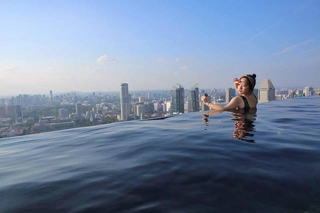 滨海湾金沙酒店于2010年6月开业,耗资175亿英镑,它由三栋建筑主体支撑,顶端用一艘飞船似的建筑物连接,购物中心、赌场、酒店连成一体,是一个非常庞大的综合体,最令人叫绝的是,住客可以在57层船型无边泳池,一边游泳一边俯瞰整个城市景观。