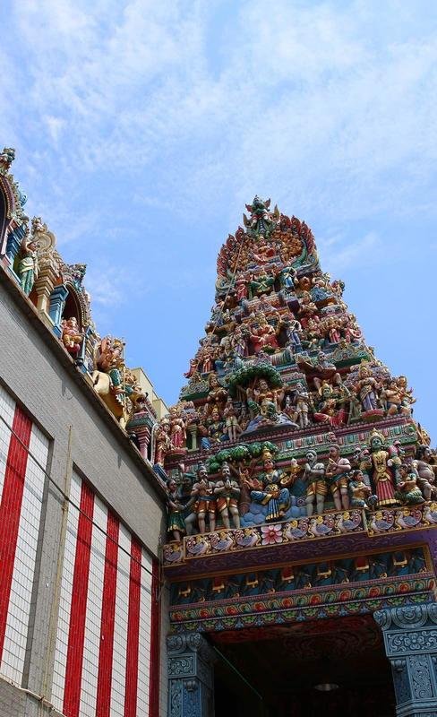 极尽色彩所表现的印度教诸神与动物雕像,都刻在高达15米的寺院大门上,耀人眼目,前来朝拜的信徒无数。