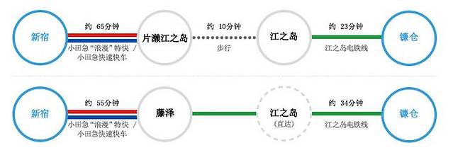 镰仓一日周游券是指新宿往返镰仓境内的“小田急镰仓周游券”,在新宿小田急浪漫特快售票处就可以买到,费用是1470日元,包含了新宿往返藤泽(55分钟左右)或者片濑江之岛(65分钟左右)的小田急费用,以及镰仓境内藤泽——江之岛——镰仓站一线的江之电费用。江之电沿途站点: