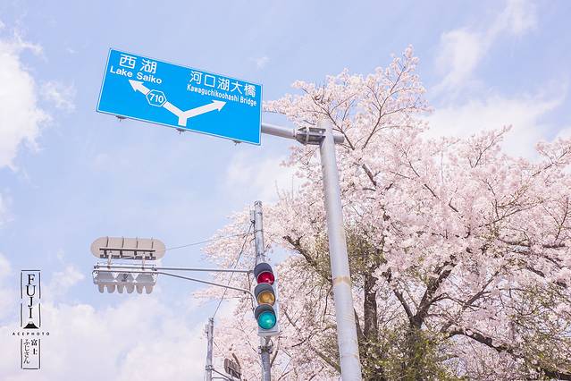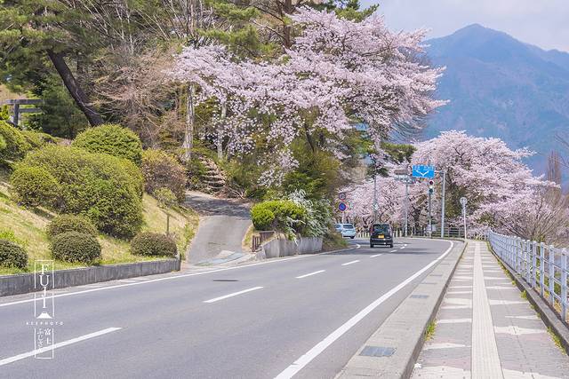 整个河口湖大道走不多远就能看到成片的樱花树,加上今天的好天气,远远看上去十分梦幻,如果有时间租辆自行车也是一种很好的游览方式。
