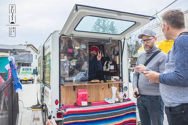 移动咖啡车里的大叔看到我在拍他,微笑并对我比起了剪刀手,看起来十分友好。
