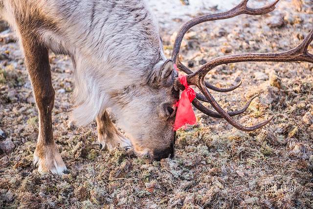 这里的驯鹿很温顺,一点儿不惧怕也不会攻击人,只知道埋头扒开积雪寻找地衣和苔藓吃。样子十分憨厚可爱,让我也忍不住带上鹿角和他们来一次亲密接触。