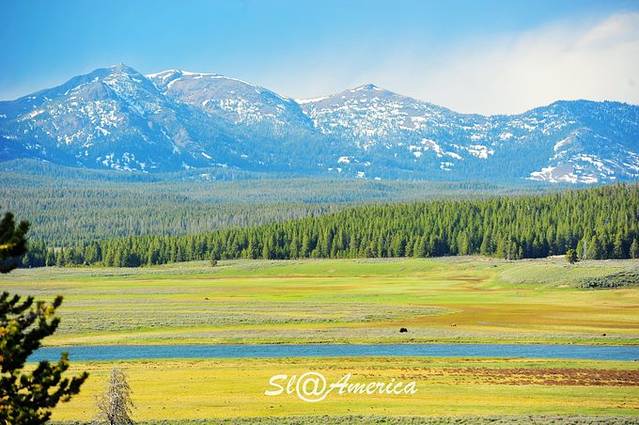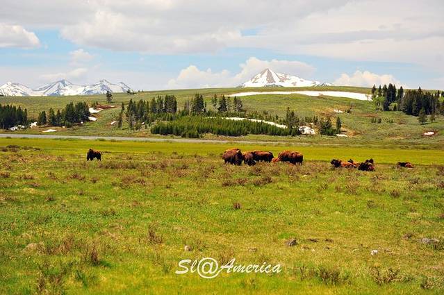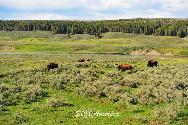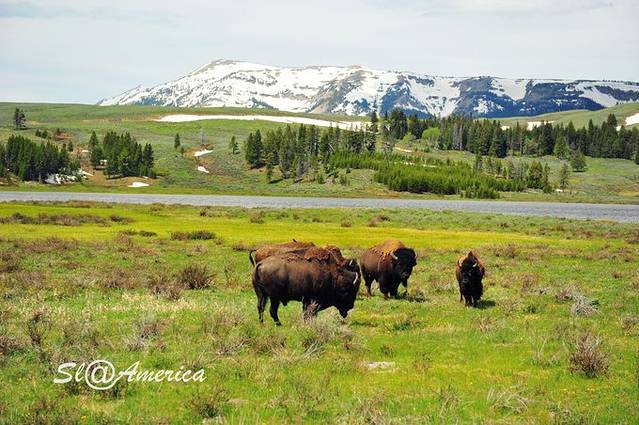 由于已经去过棉花堡,因此并没有在猛犸象待很久,便一路下行去往诺里斯间歇泉方向,中途会路过类似海登山谷那种的草原区域,路边总是有不少野牛在闲逛,这种动物基本是我在黄石公园里见到最多的动物。