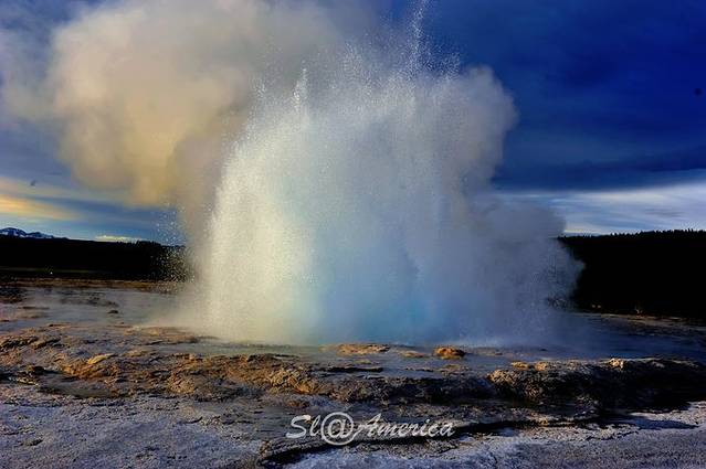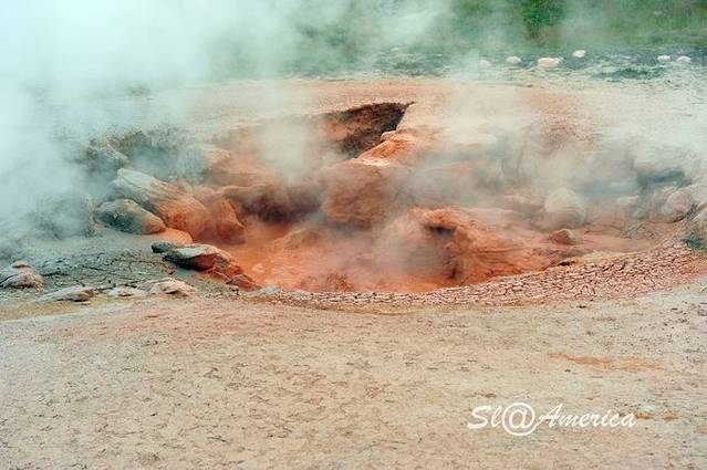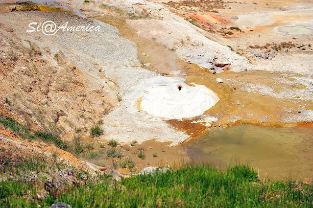 间歇泉,黄石公园中的众多间歇泉之一,虽然名气不如老忠实泉大,但它爆发的力度和持久度完胜老忠实泉