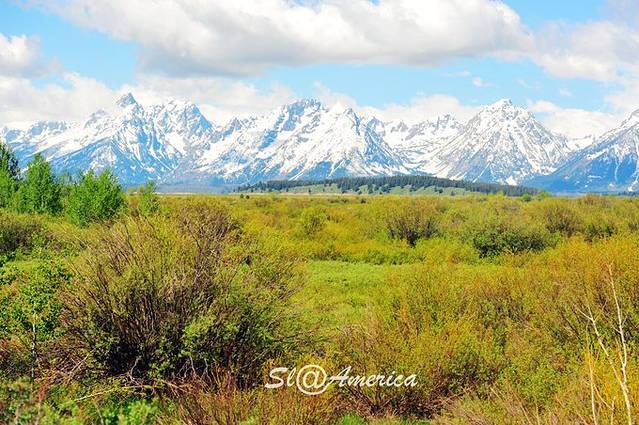 大提顿国家公园(Grand Teton National Park)以连绵的雪山山峰著名,沿着大提顿山脉绵延超过200英里长,伴随着(蛇河) (Snake River)流经国家公园,园区内巍峨的雪山高耸入云,广阔的草原,纯净的湖水以及丰富的野生动物共同构成一幅美丽的画卷。著名的派拉蒙影业(Paramount)的标识中,那雪山顶山环绕一圈五星,其背景就是大提顿国家公园的雪山。