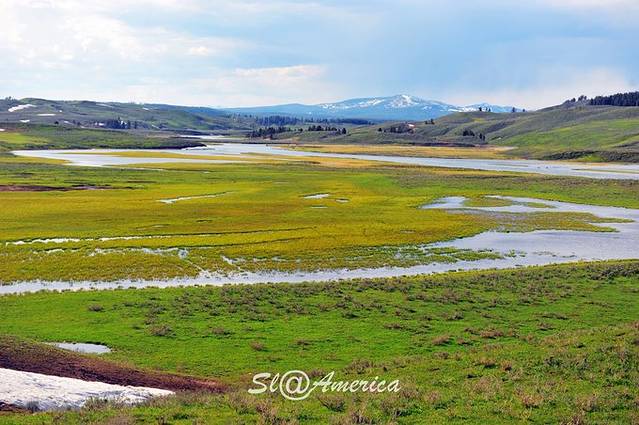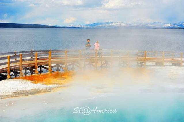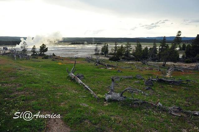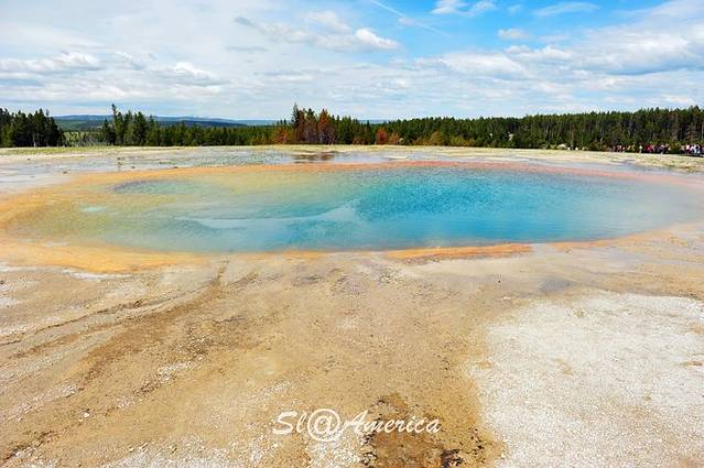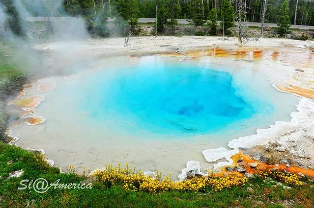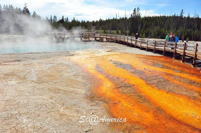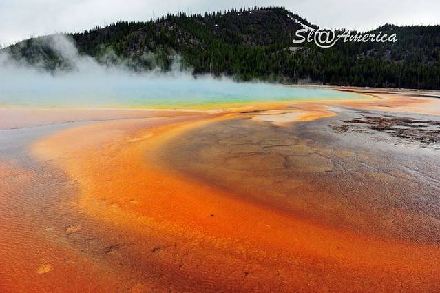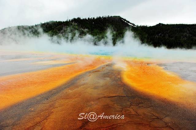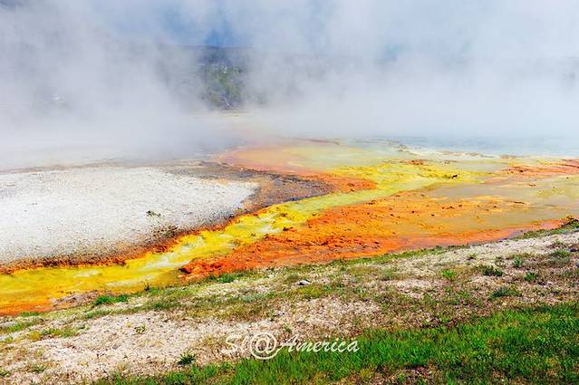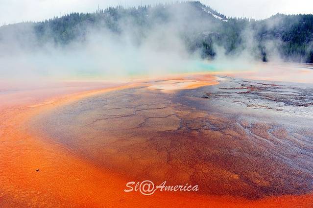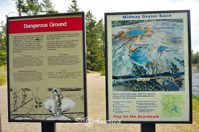 其实,黄石右下部的区域总体分为,下间歇泉盆地 Lower Geyser Basin、中间歇泉盆地Midway Geyser Basin和上间歇泉盆地Upper Geyser Basin等三个区域。大棱镜泉位于中间歇泉盆地Midway Geyser Basin。