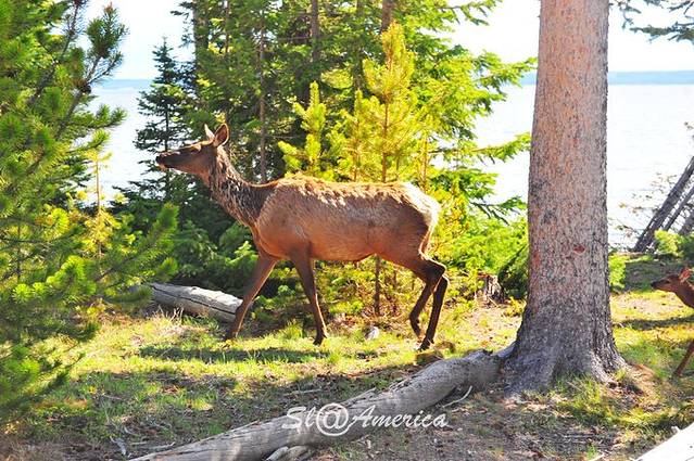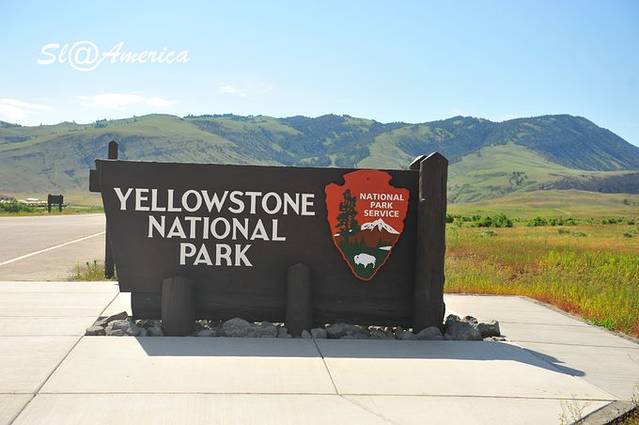 第二次进入黄石公园,终于拍到了一张黄石的标识照片。虽然出发挺早的,但中间路段遇到维修公路,耽误了不少时间,进入公园已经差不多10点左右了,这时公园内的车辆已经很多了。