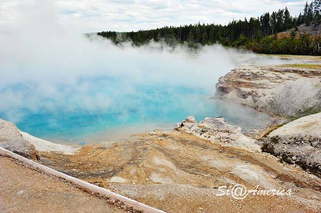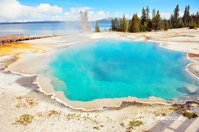 沿着步道前进,你还会发现类似西拇指里面漂亮的五彩温泉,透蓝的水质让人为之着迷。