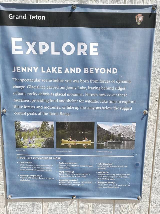 Jenny Lake珍妮湖,是大提顿公园里的第二大湖,也是西线最重要的景点之一。个人感觉这个湖也没有说多少美,但重点在于它靠近背后的诸多雪山。珍妮湖最著名的玩法有两个,一个是环湖徒步走Jenny Lake Trail,全长大约10公里;另一个则是可以进行船游观景,或者乘坐Shuttle Boat到达Inspiration Point和Hiden Fall,但旺季船票需要提前预定,并且提前查询公园内步道的开放情况。