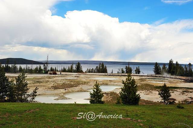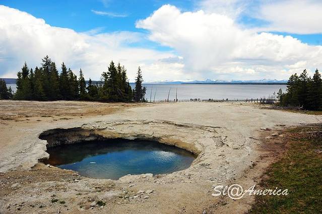 西拇指温泉,第一个接触到的黄石公园里的温泉,虽然比不上大棱镜那般震撼,但蓝天白云下的清澈也是足够迷人