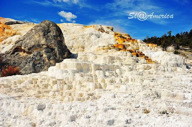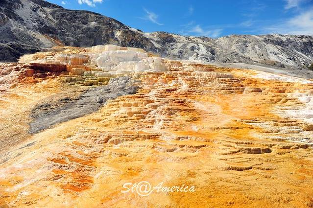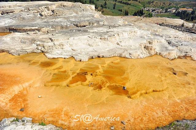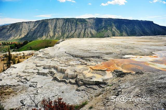 猛犸象温泉(Mammoth Hot Springs)是世界上已探明的最大的碳酸盐沉积温泉。其景观以石灰石台阶为主,也称热台阶区,可分为上台地(Upper Terraces)和下台地(Lower Terraces)。猛犸象温泉的泉水来自于诺里斯间歇泉盆地,水温可达77℃,很多藻类生活在温泉中,使得温泉的颜色呈现出棕色、橙色、红色和绿色。奔流不息的温泉随着阶地奔腾而下,且颜色各异,形成了一个七彩的大台阶,景象非常恢宏壮观。
