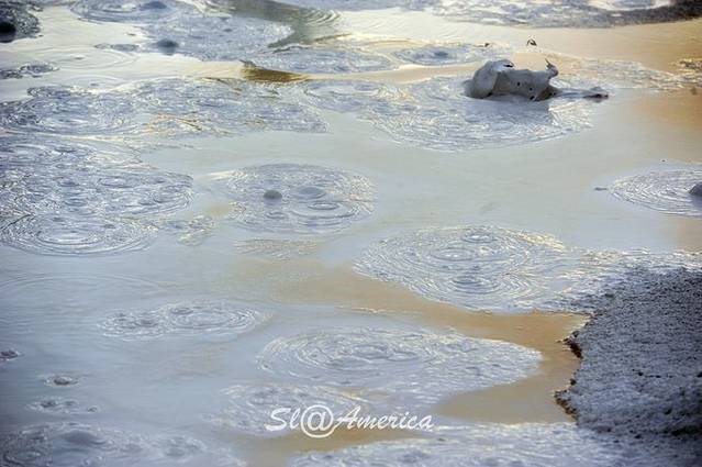 这个泥浆池里可以看到粉红色的色彩和不少不停冒出来的气泡。