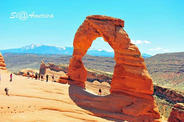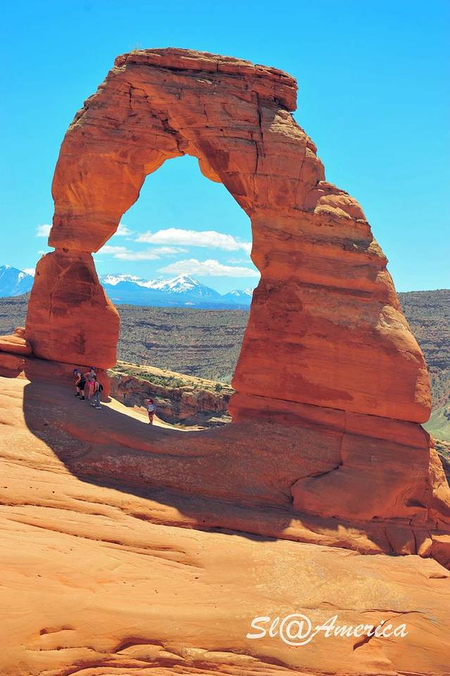 我们的体力都还不错,比预想早的到达了精致拱门,不过正好是正午,并不是个拍照片的好时候,想比日落下的拱门会更加优美。当巨型的拱门配上雪山作为背景,确实构成了一幅精致的画面,不亏被称为精致拱门。我倒觉得,拱门也像是一面巨大的镜子,里面映衬着高山美景,想想这么美的画面,也许以后再来就有所变化,或者不再存在了。毕竟岩石都会不断收到风蚀等状况的影响。