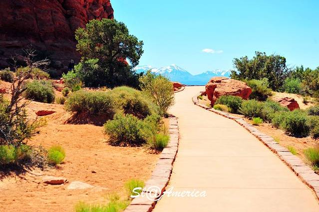 平衡石小道周边的景色其实也是很好的,在路的尽头,不远处就可以看到开阔的岩石和雪山,要想把拱门公园里面的奇石看个遍,那绝地是需要很强的体力的。