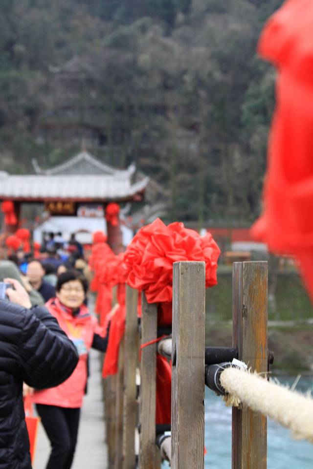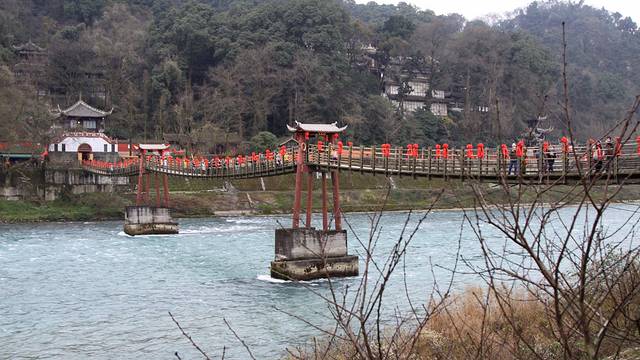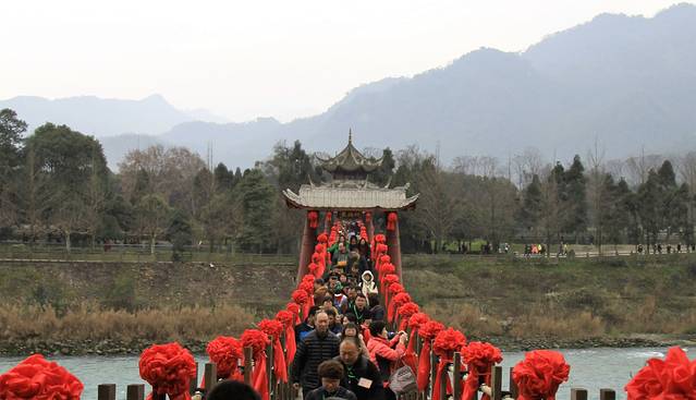 安澜索桥是从金堤前往二王庙的必经之路,桥上的游客络绎不绝。立于桥上,脚下就是滔滔江水,举目远眺,群山不尽,不自觉的心潮澎湃。