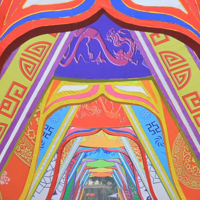 广场中轴线上,十五组汉服衣袂翩翩展开,龙凤、祥云、花鸟、藤蔓等传统刺绣纹饰点缀其间。游客穿行其间,重重锦绣,衣袂飘飘,让人忍不住放慢脚步,细细品味这华服幻彩的美景。