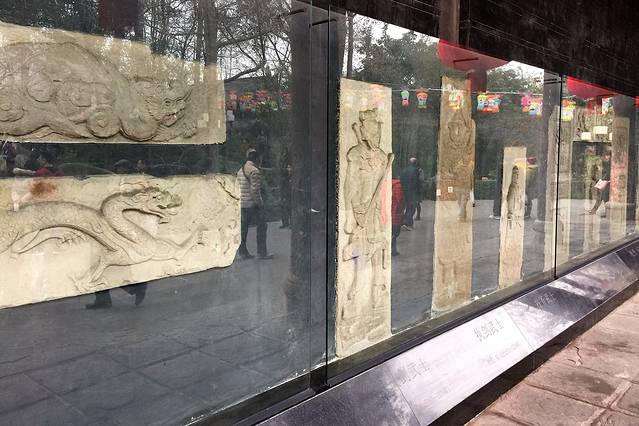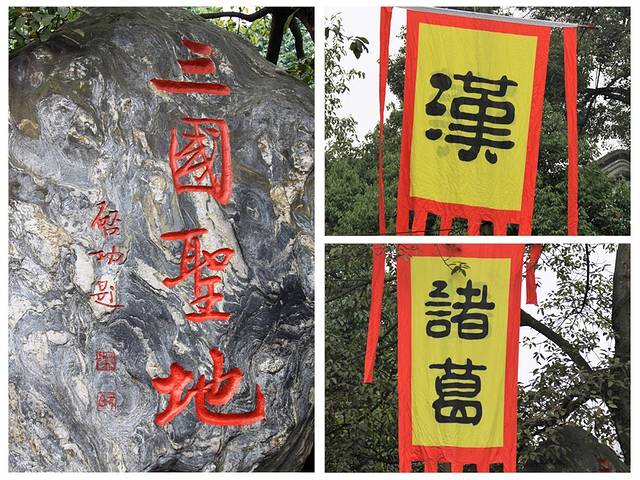 进大门,左右两侧分别有唐碑和明碑。 唐碑即“蜀汉丞相诸葛武侯祠堂碑”,是唐朝著名宰相裴度撰碑文,书法家柳公绰书写,名匠鲁建刻字。三位名家联手,文、字、刻,样样精湛,因此被称为三绝碑。