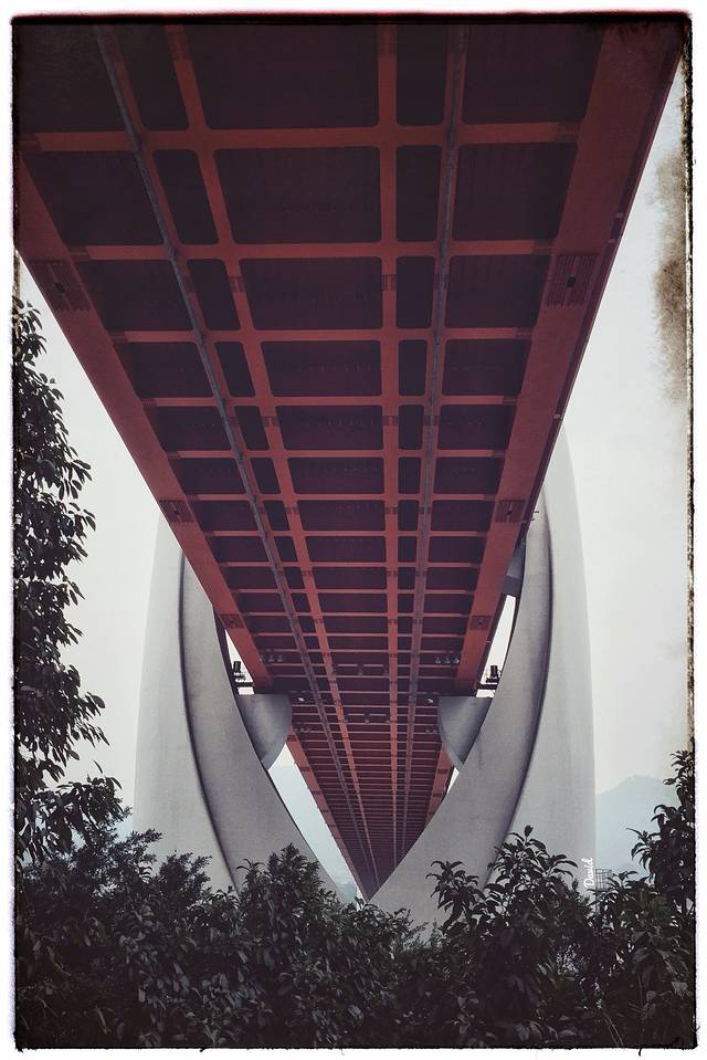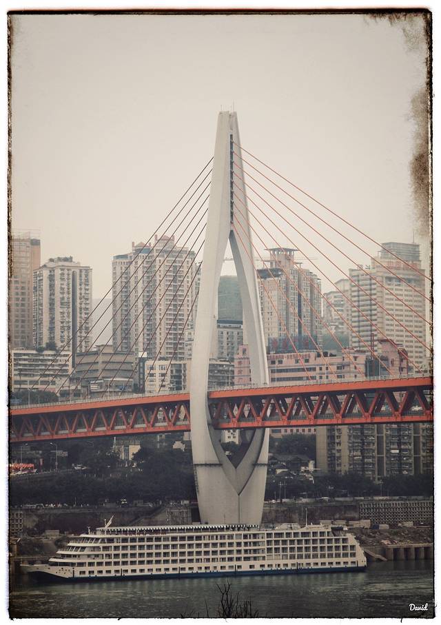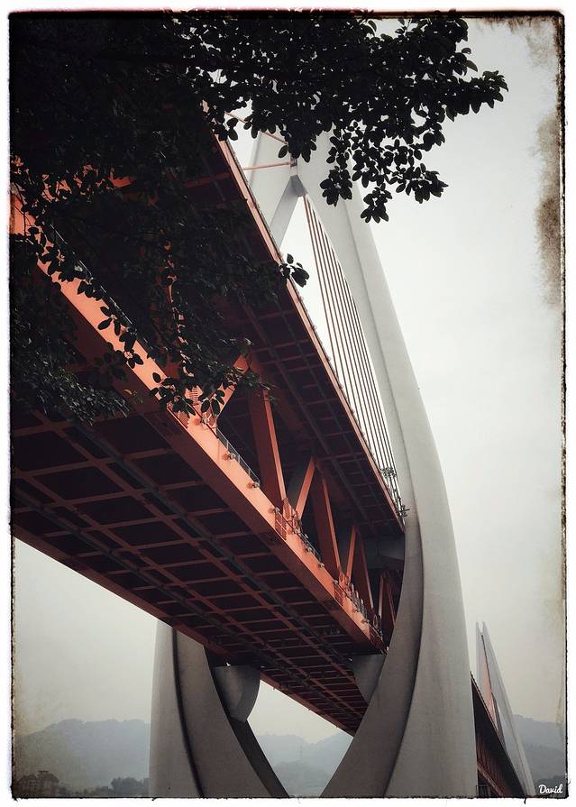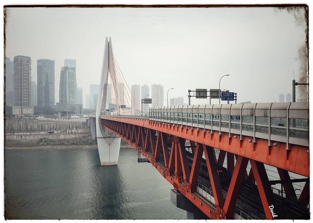 沿着沧白路又走了一会,转个弯就能看到一座横跨嘉陵江的大桥,这就是2015年4月通车的千厮门大桥,它连接着渝中区和江北区,全长720米,分为上下两层,一桥两用,上层走汽车和行人,下层走轨道6号线。大桥的主体像一个天梭的造型,斜拉的钢索又像一把竖琴的琴弦,仿佛每天都在为山城、为这里的人们演奏着优美的乐章。