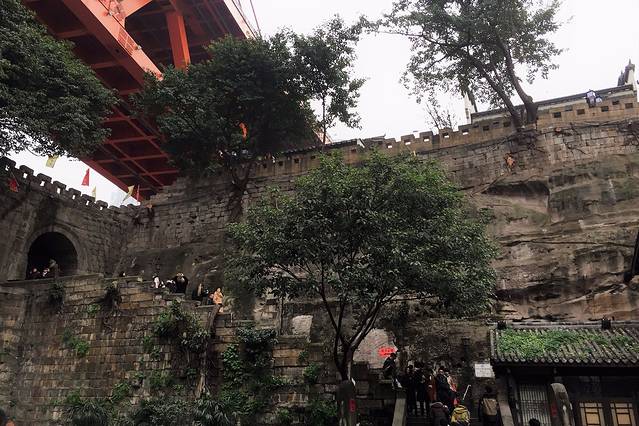 很快就到了龙门路,本来想让师傅停到龙门路和南滨路的交汇口,我想去长江边拍几张照片,但是师傅说不好停车,直接给我拉到了龙门路大斜坡的上边,机缘巧合下,我也寻到了一个开阔地,上能看到长江索道,下能看到东水门大桥和航行中的两江游船,同时还能全景观看大半渝中区,所以说,爱笑的男人,运气不会太差。在咔嚓咔嚓一通狂拍后,赶紧顺着龙门路往上走,因为我发现往上走的游人越来越多了,再耽误会,我估计排队都费劲了。