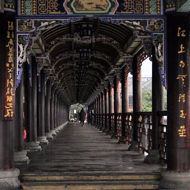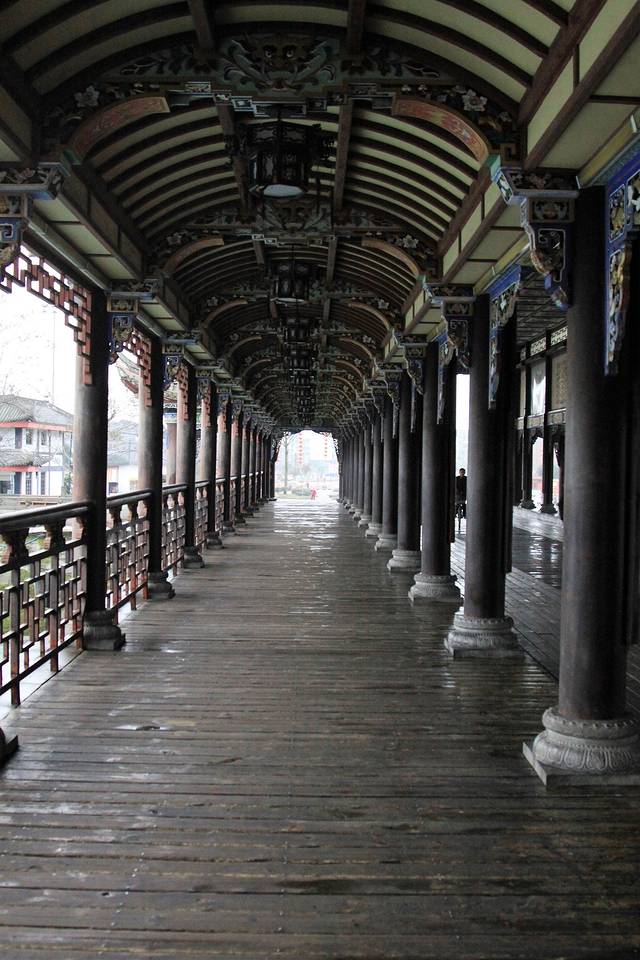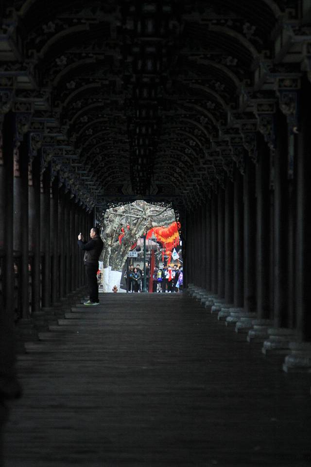 过了清真寺,就看到一座雄伟壮丽的廊桥横跨在碧绿的江水之上。这就是南桥,原名“普济桥”。桥上的各种彩绘、雕梁画栋、民间彩塑、书画楹联溶为一体,被誉为“水上画楼”。