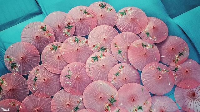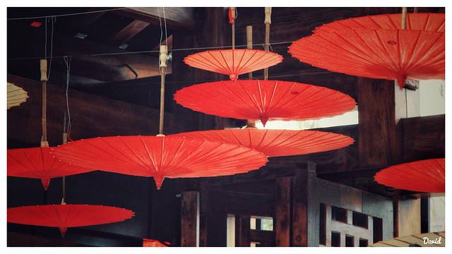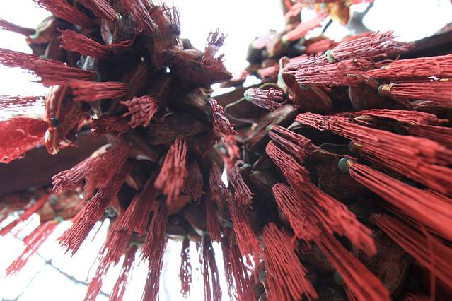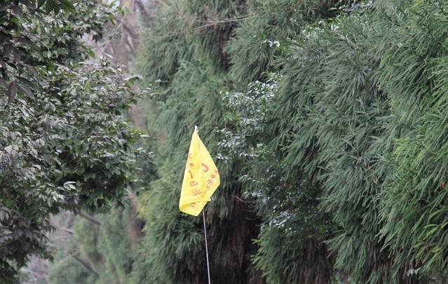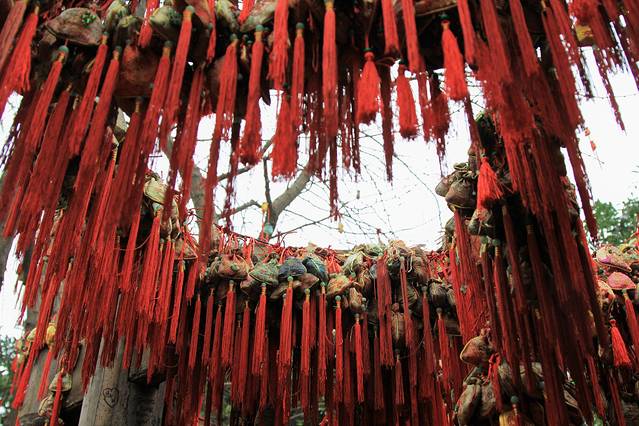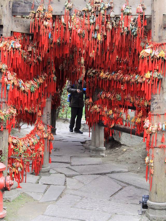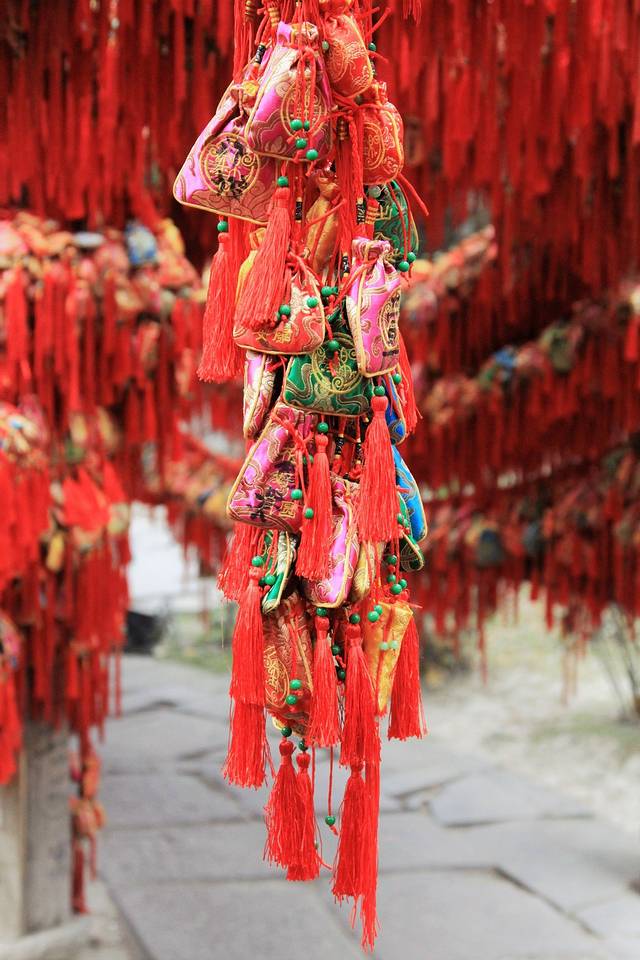 路边一侧的树上,层层叠叠的悬挂了许多五颜六色的荷包,这些都是游客们用来祈福迎新的。