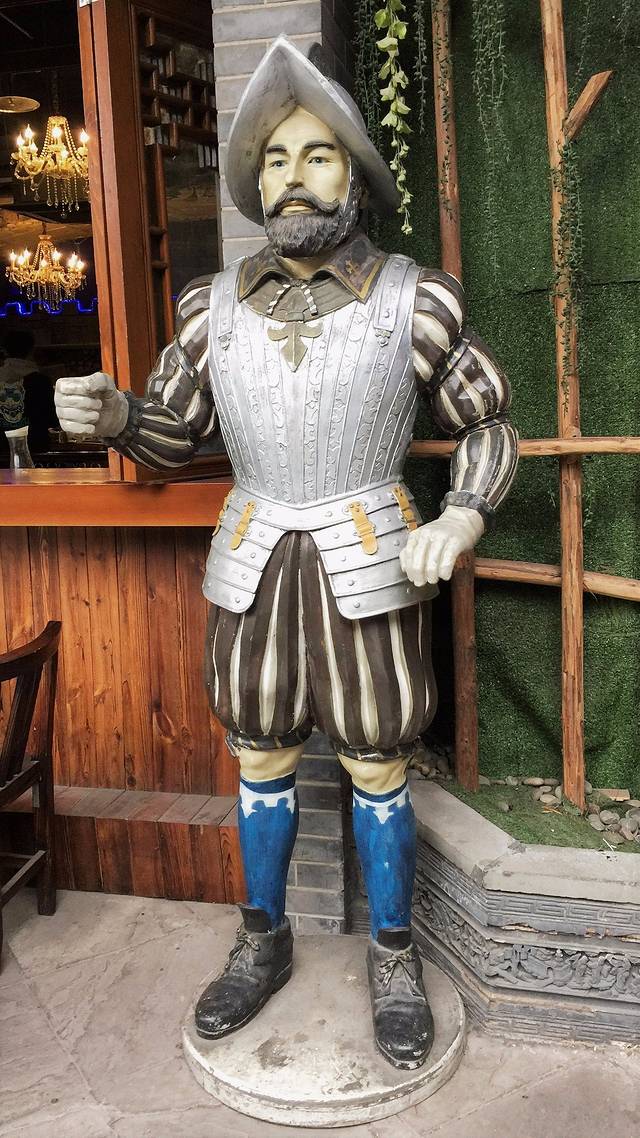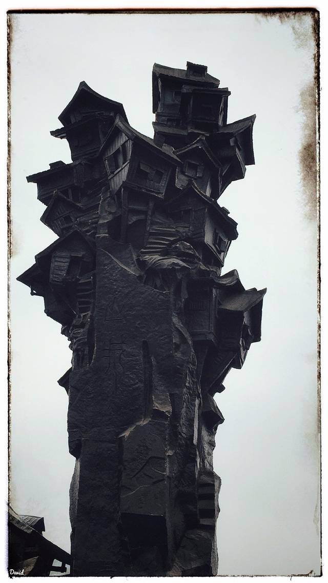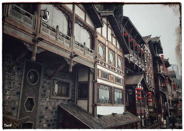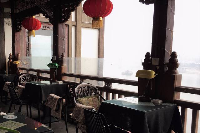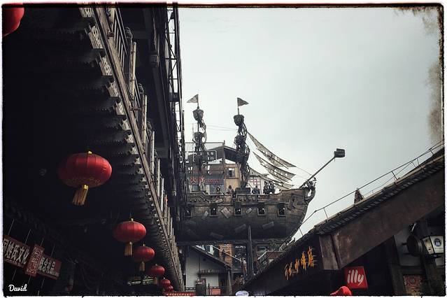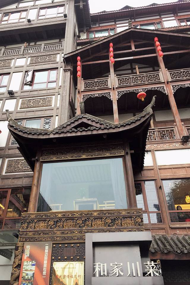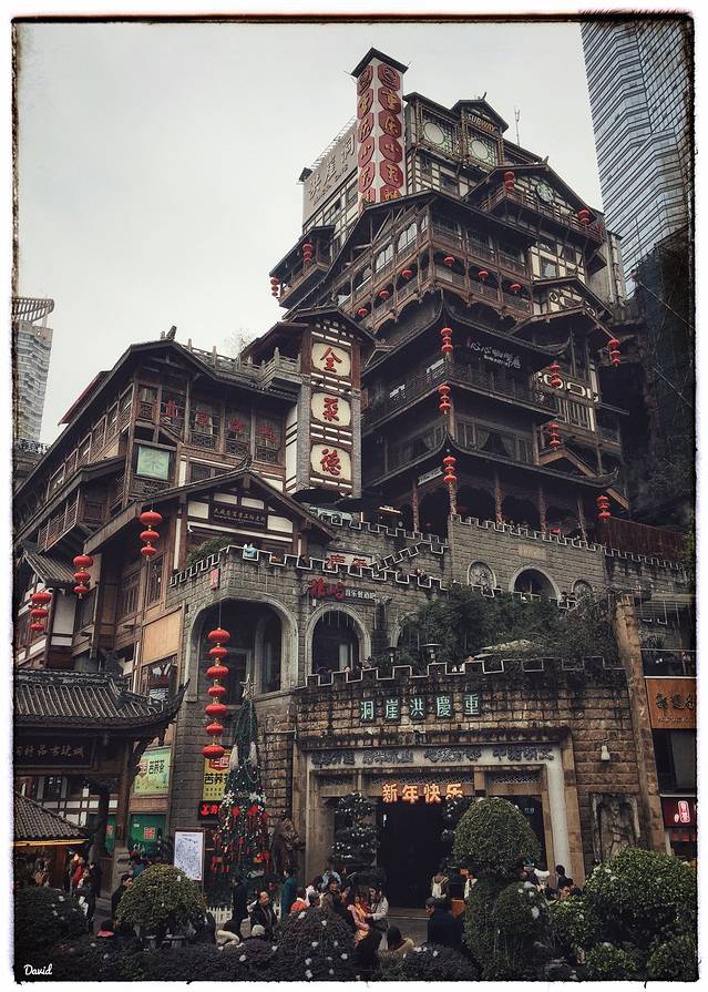 我是从千厮门大桥直接走过去的,所以位于了洪崖洞的顶部,首先看到的是一个展现洪崖洞特点的柱状铜雕建筑,再往前是一搜海盗船。然后乘坐扶梯进入异国美食街,这条街基本上突出的就是“异国”二字,不管是整条街的风格,吃饭的馆子,以及各种美食,甚至于临江的咖啡馆也是一派异国情调。