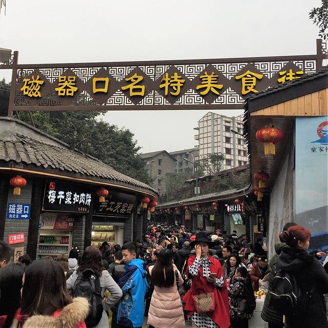 本来准备乘坐T003路公交去磁器口古镇,但是排队的人已经很长很多了,而且排了一会后,发现根本没有车,再一联想到这拥堵的山路,果断放弃乘车,选择步行原路返回,返回的路程同样拥堵,人群行走的也很缓慢,有很多人更是边走边聊,甚至把步行的路都堵上了,所以行进速度如同爬行的乌龟。好不容易才沿着壮志路走到了G212,然后过了天桥一路向北沿着G212一直前行,远远就看到磁器口地铁站的出入人群非常多,又在童家桥立交右转并向东继续沿着磁童路缓慢前行,很快就能看到“磁器口名特美食街”,但这里真的不是磁器口古镇啊,穿过熙熙攘攘的人群和两边的各色小店,继续前行几分钟,就能看到磁器口古镇的大牌楼,然后跟着人群继续前行,很容易就能找到磁器口古镇的入口,然后进去欢乐的看人海吧。