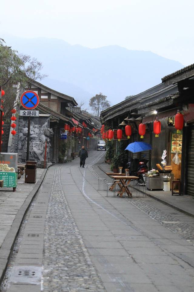 大巴车一路顺利很快就到了第一站,灌县古城,这是一座与千年古堰相伴的古城。 当然了,我们只是坐着小电瓶车简单的游览了下,因为时间太早,商铺没开门,古城里除了一个一个旅游团以外,街上当地的人都很少,可能还在睡懒觉吧。