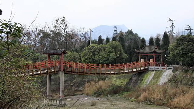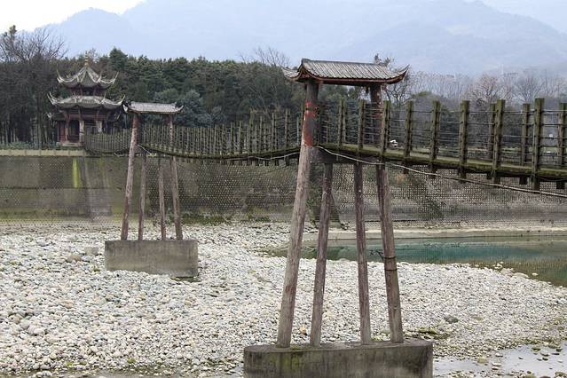 安澜桥一座名播中外的古索桥。最早称绳桥或竹滕桥。到了宋代,改称“评事桥”。明朝末年毁于战火。清嘉庆八年,何先德夫妇倡议修建竹索桥,以木板面,旁设扶栏,两岸行人可以安渡狂澜,故更名“安澜桥”;民间为纪念何氏夫妇,又称之为“夫妻桥”。