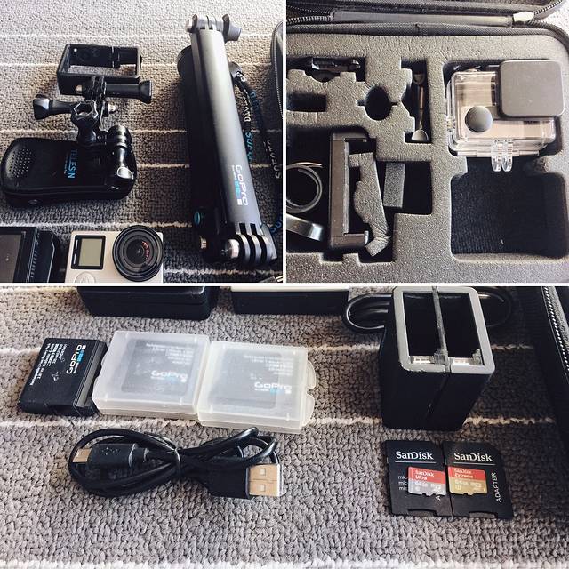 A:GoPro Hero4 Black*1、原装液晶屏幕*1、SanDisk64G存储卡*2、金属框架*1、防水壳*1、电池*3,电池双充电器*1,电源线*2,GoPro自拍杆*1、背包夹*1、多连头*3、多向转接头*1、长螺钉*3、短螺钉*1