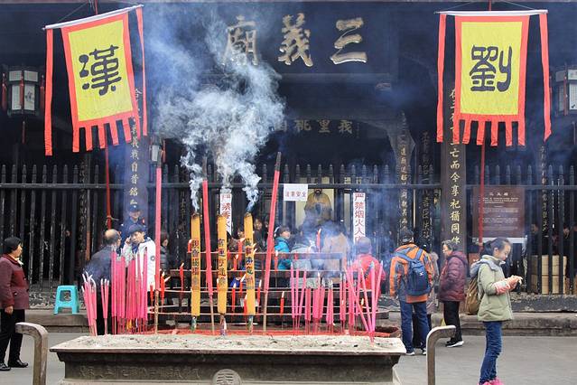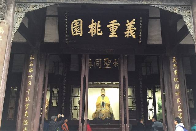 三义庙,初名三义祠。原位于成都提督街,始建于康熙年间,1997年因城建需要整体迁建于武侯祠内,建筑构件、匾额等均采用原物。现三义庙由拜殿、大殿和两廊组成。
