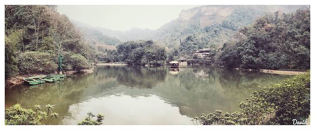 跟随着许多游客一路上山,很快就看到了一片湖泊,此湖名为“月城湖”。