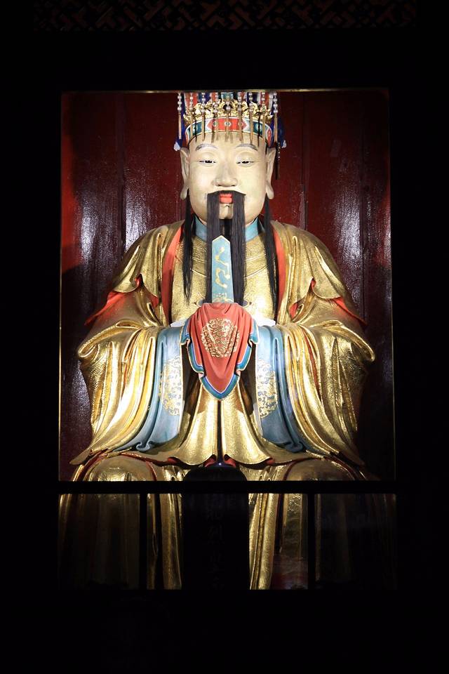 殿堂正中有刘备贴金塑像一座。两侧为关羽、张飞塑像。