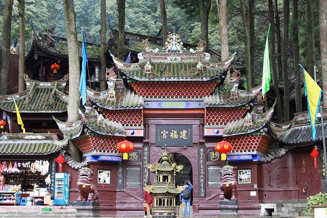 “建福宫坐落在青城丈人峰下,位居前山山门左侧。宫观始建于晋代,原址在青城天国山中,唐开元十八年(公元730年),奉敕迁于今址。宫观原名丈人观,南宋时朝庭赐名“会庆建福宫”,简称“建福宫”。宫内主祀青城主神宁封真人及杜光庭先生。今建福宫系清代重建,近年又大规模扩建,现有大殿三重,分别供奉五岳丈人、太上老君、东华帝君等神像。宫前有清溪和缘云阁,宫后有赤诚岩、乳泉、水心亭、梳妆台、林森洞等各名胜古迹,还有长达394字的清代青城山著名长联。建福宫,古木葱茏,在云峰岚气怀抱中,环境十分青幽,是游览青城山的起点,不可不游的第一宫观。”