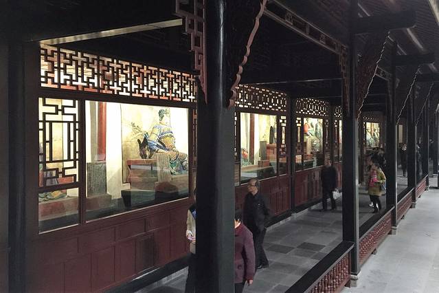 穿过二门,可以见到“文华辅国”的文臣廊和“武雄知兵”的武将廊,东、西廊房分别塑有蜀汉文臣、武将坐像各十四尊。东侧文臣廊坊以庞统为首,西侧武将廊房以赵云领衔。