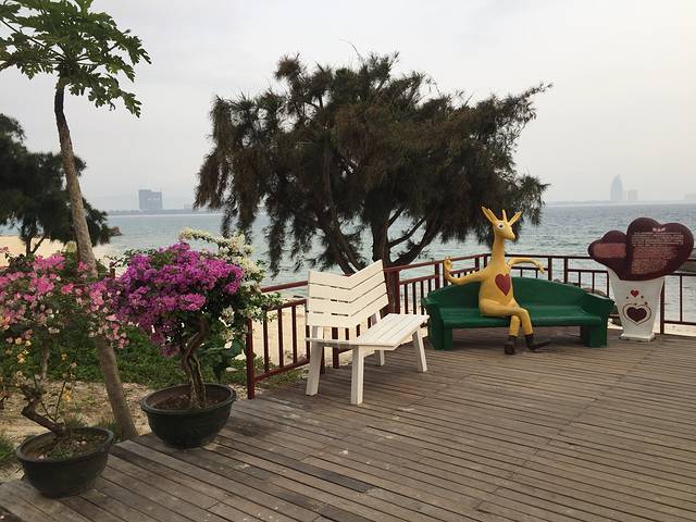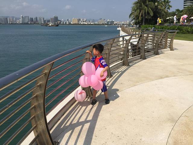 下午4点多,我们坐着酒店的电瓶车出了凤凰岛,出了岛往左一拐,下了台阶就是三亚湾的著名景点——椰梦长廊。而我们家豆豆不是来看椰林的,他是来海边拣贝壳的。。。。。
