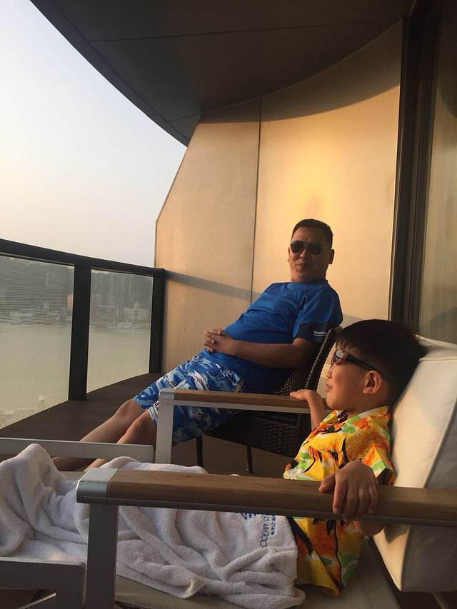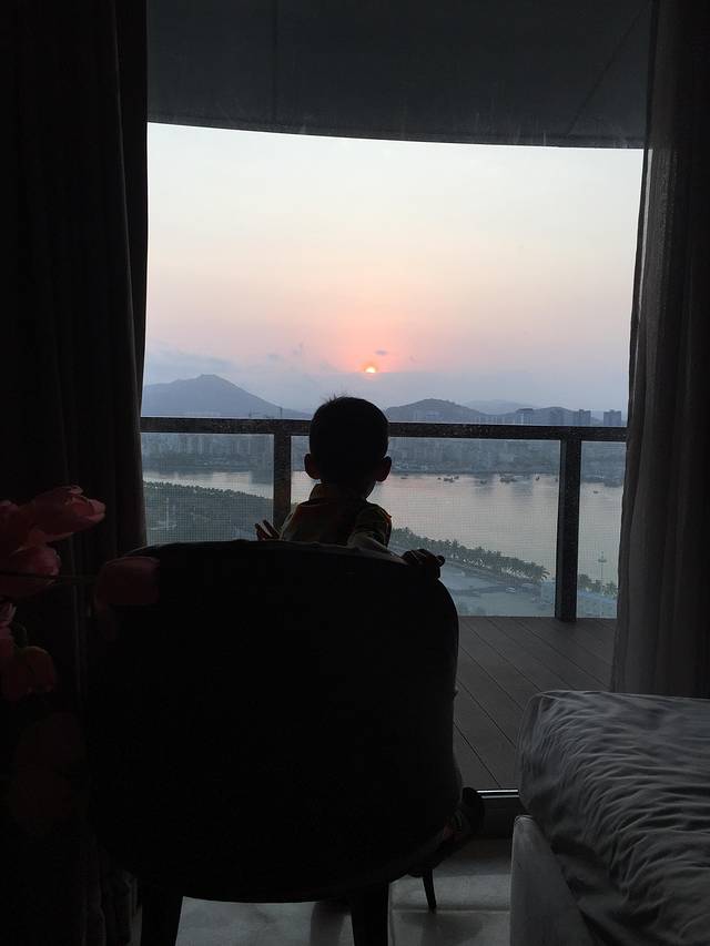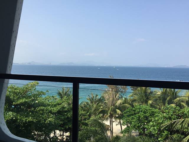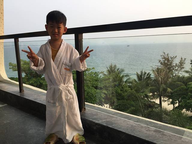今天7点多才醒,问我为什么? 这床太舒服了!!!在阳台上坐了一会儿,豆豆也起来了。 我们在阳台上看风景等着老婆起床。全海景房的好处就是可以躺在床上看大海。