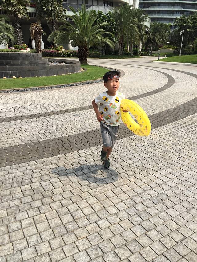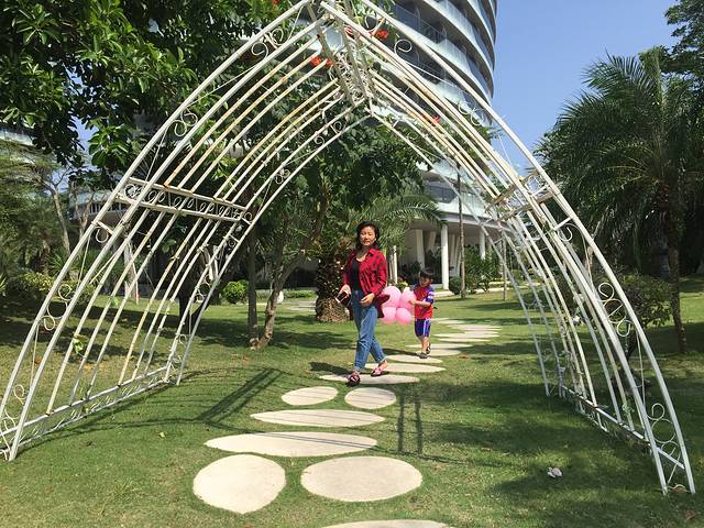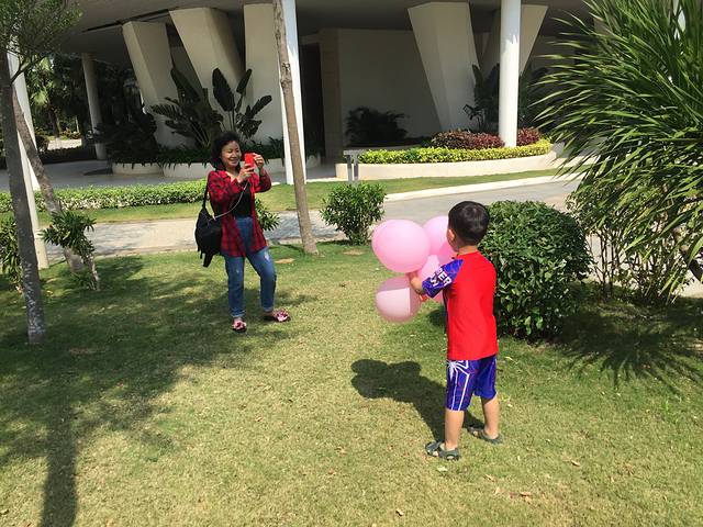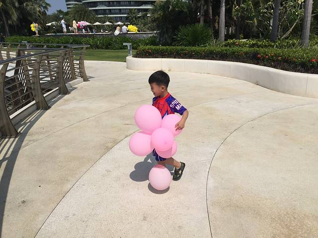 从4号楼往泳池走的路上,豆豆捡到几个气球,谁这么好心,还送气球呢? 后来才发现泳池的景色太美了,N对新人在拍婚纱照。 这气球是他们拍照和道具。。。。。。