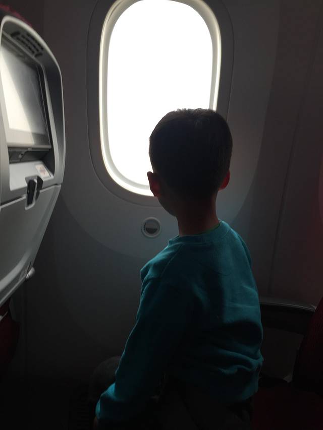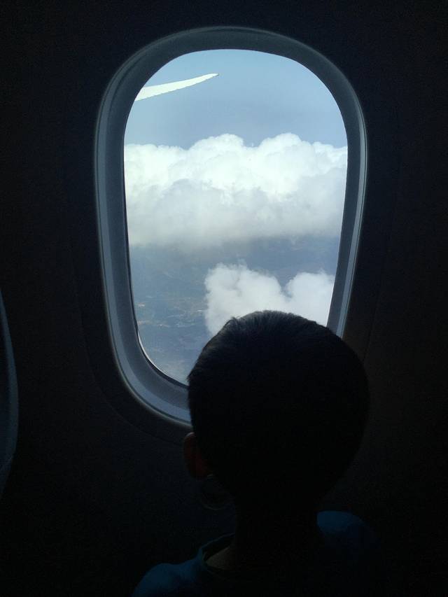清晨6:00起床,用最快的速度洗刷完毕,6:30分滴滴叫了一辆出租车,开始了我们一家三口的旅行。因为是早上早高峰之前,出租车只用了40分钟就抵达了首都国际机场,但在T1航站楼外边堵了将近15分钟。终于下车了,这是豆豆第二次坐飞机,上次也是坐的海航也是T1航站楼。取票,托运行李,安检,直奔登机口,到达登机口的时候,正好开始登机,简直是太顺利了,一分钟都没有登待就登机了。吐槽一下海航的登机〜〜〜!!!! 也不知道为什么海航的登机口永远是那么的远,最扯的是要坐摆渡车才能到飞机那里。 在走到登机口的路上我问豆豆冷不冷,豆豆说现在是春天了,不冷了。 我说那咱们飞到夏天去吧,豆豆想了想说:好!于是我们就登上了飞往夏天的航班〜