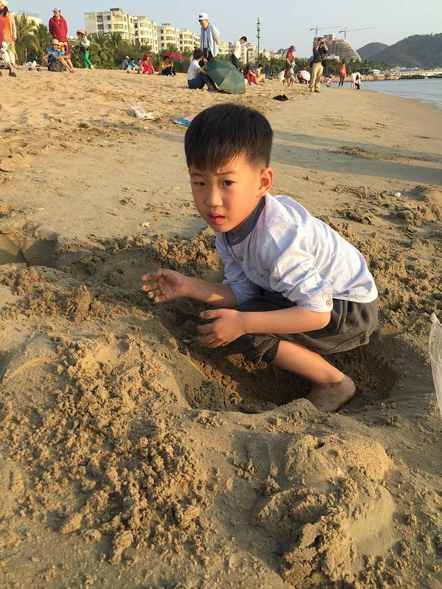 今天会玩了,在海边挖坑,还挖水道,让浪顺着水道流到坑里边来。