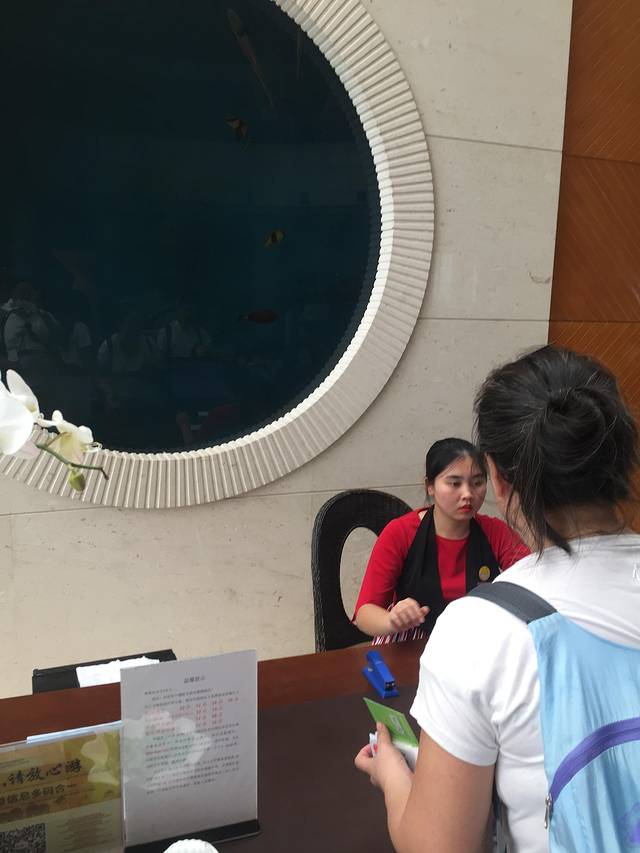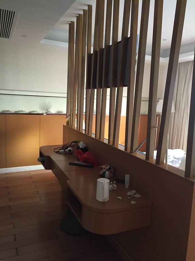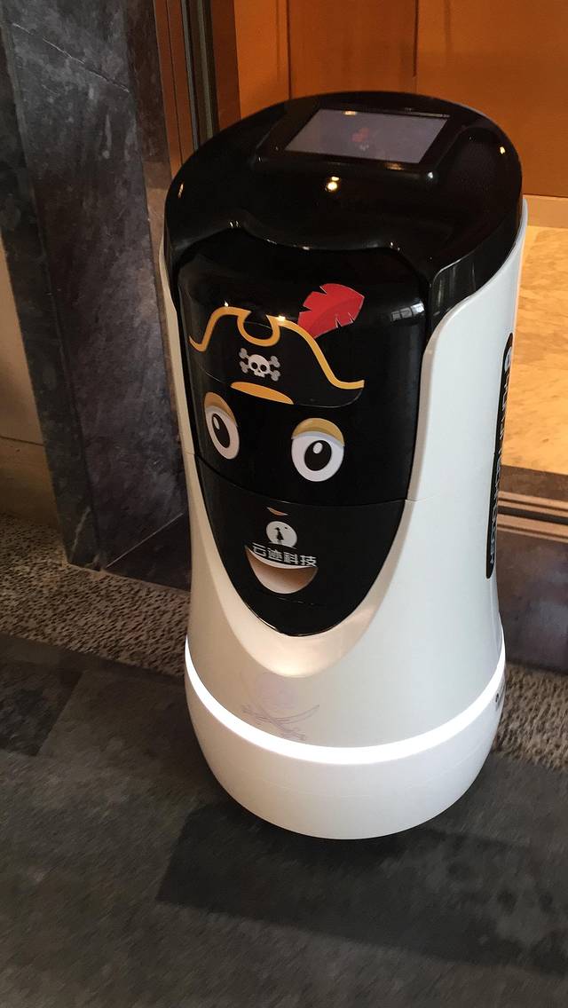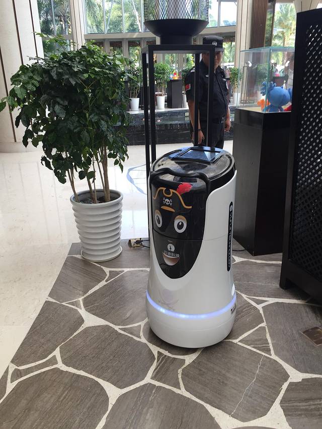 去客房找礼宾部,当时大厅里的人太多了,我们自己过去找的,礼宾的服务员带我们来到了这个家伙面前,问了我们的房号,她直接输入房号,然后说它会带我们去房间的。 接下来我们三个就跟着这个家伙来到了房间,这一路上听着它给我们介绍酒店,它自动开电梯,自动设置电梯里要到达的楼层,然后再自动带我们去房间。 我就在感叹人工智能在我们国家已经发展到这个程度了。 大概5分钟后,机器人停在了我们入住的房间门口。我拿房卡开门后,机器人自己走回了大堂,大概10分钟后机器人又来了一趟,这回是它送了两把蜈支洲岛珊瑚酒店的折扇。。。。 这家伙还能送东西过来!!! 如果是这样的话,以后酒店的服务员就只剩下打扫卫生的工作了!好了,不说这高大上的机器人了。