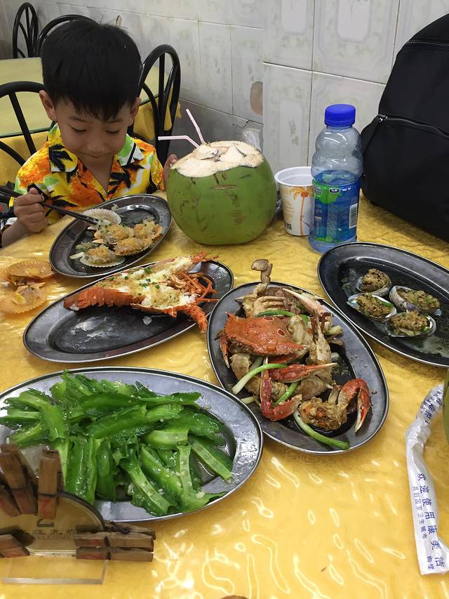 接下来就是挑海鲜了,说句实在话,这里的海鲜比北京的确便宜一些。 海虾从20元〜35元不等。 皮皮虾从50元2斤到80元一斤的不等,螃蟹有便宜的有贵的。 生蚝也是有便宜的有贵的,满市场挑的眼都花了。咋办? 哥从小就逛菜市场,小时候就会砍价。 龙虾(小个的)60元一只, 螃蟹3只 65元, 扇贝20元,鲍鱼5块钱一个,我买了6个。 还买了网上传闻非常好吃的四角豆。直奔海鲜加工店,一路上各种拉客。 随便找了一家就进去了,你问我为什么随便找一家,我只看哪家人多就进哪家。 进去之后直接拿着海鲜到后边找老板算加工费,就按网上的加工费算,不能按他们店里的明码标价的,那个加工费好贵的。 要讲价钱的, 最后加工费收了我120。还可以接受,门口的椰子店10块钱一个椰子,我买两个砍到了15块。 吃海鲜应该喝点酒,但是我想了一下,椰子多好啊。 纯天然的饮料,对吧〜〜〜