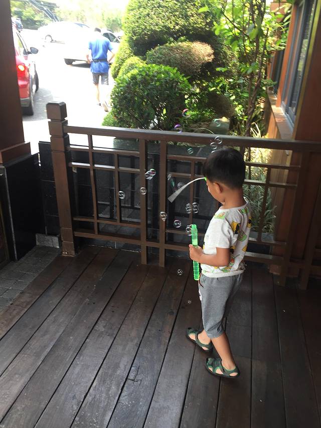 看,大堂门外满天飞的泡泡全是豆豆弄的。