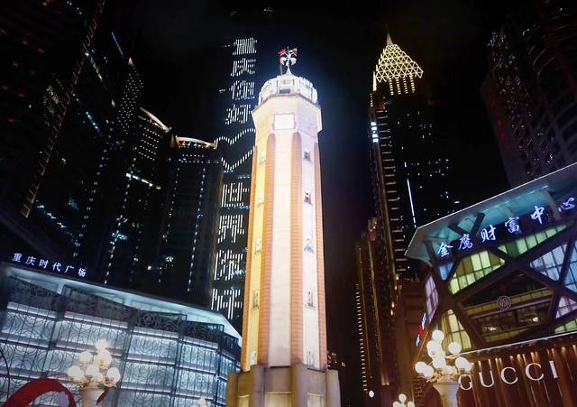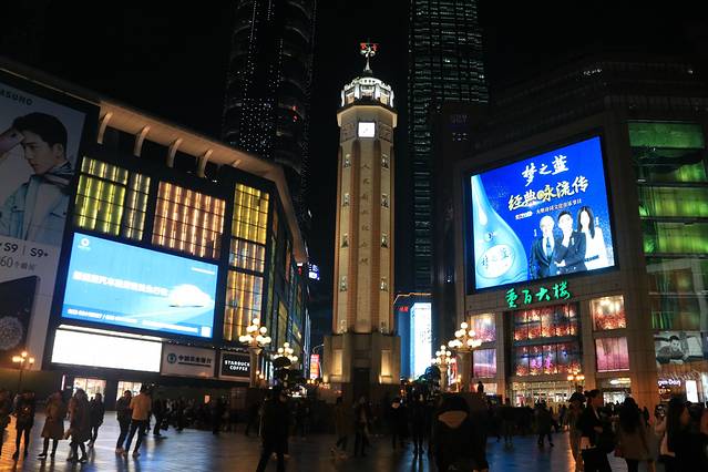 解放碑其实有两层含义,广义上是指重庆的市中心解放碑商圈,狭义上是指重庆人民解放纪念碑。来重庆,解放碑肯定在必打卡地点之列。如果去得凑巧,在整点时分还能听到解放碑的钟声。钟声在平时是没什么稀奇,可到了平安夜、圣诞夜和跨年夜,这里可是挤着成千上万的人来听钟声,场面十分浩大,可以用人山人海来形容了。