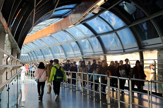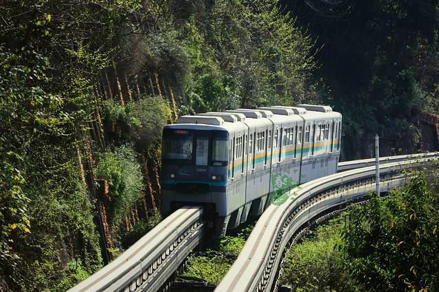 下了轻轨后,我们没有直接出站,而是走到最边上的栏杆处,开始守株待兔,先调好参数,取好景,等着轻轨过来。其实轻轨并不难等,难在行驶中的轻轨并不好拍,一不小心糊了或者出了别的问题,就只能继续等。拍了差不多四五趟轻轨,终于有一张能看了。
