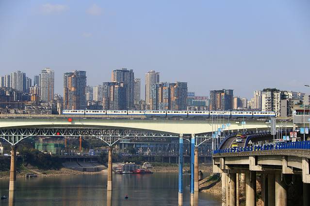 又尝试了其他几个位置拍摄后,忽然看到不远处的三号线,笔直的一条横亘在桥上,一旁的嘉陵江上泛着几条船,船只往前驶去,圈圈波纹荡漾开来,一派和谐静美之景。此情此景,突然想到一句话,不要为了追赶兔子而忽略沿途的美景。“轻轨穿楼”景象固然独特罕见,但眼前的美景也令人陶醉,不是吗?