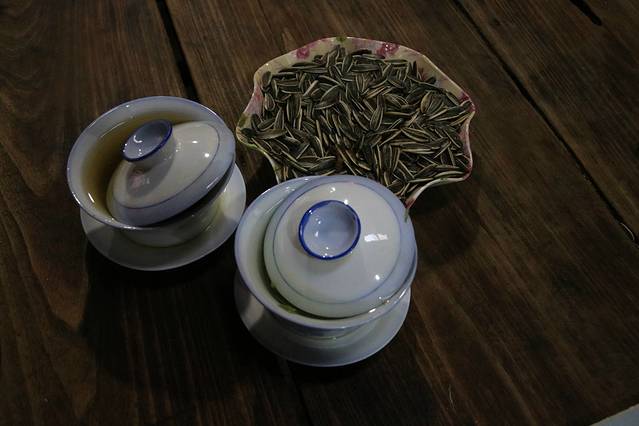 我们点了一杯红茶和一杯绿茶,又在老板的推荐下来了份瓜子。这里的茶都是盖碗茶,红茶醇厚,更适合女生喝,绿茶更为清香,但带点涩感。两者都是8元一杯,喝完可以让老板无限续杯,瓜子10元一袋。对比现在日渐飙升的物价,这里的价格平民得感人,若是你想,8元钱就可以坐一天。