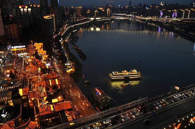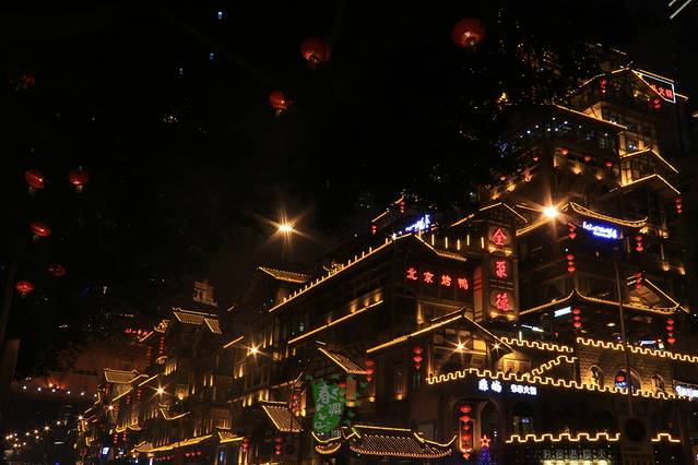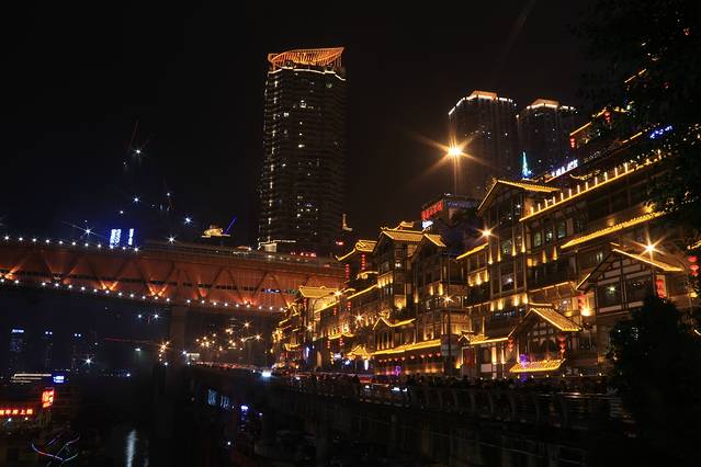 重庆的夜景素有“小香港”之称,不少人远道而来也只为一睹夜色中的重庆,而洪崖洞则成了看夜景的首选地之一。洪崖洞其实不是“洞”,而是一座仿古吊脚楼,共11层。