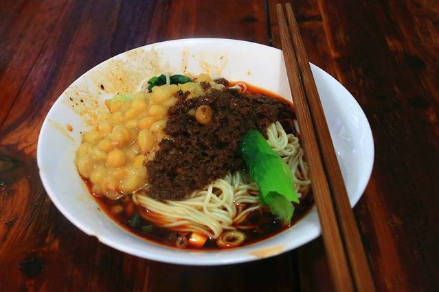 《舌尖》里说,重庆人的一天是从一碗小面开始的。所以第一天特意勤快了点,在青旅附近一家小店吃了小面。我点的豌杂面,是小面中很受欢迎的一种。一般来说,豌杂面多为干溜(不加汤),但我个人爱吃加一点点汤的豌杂。